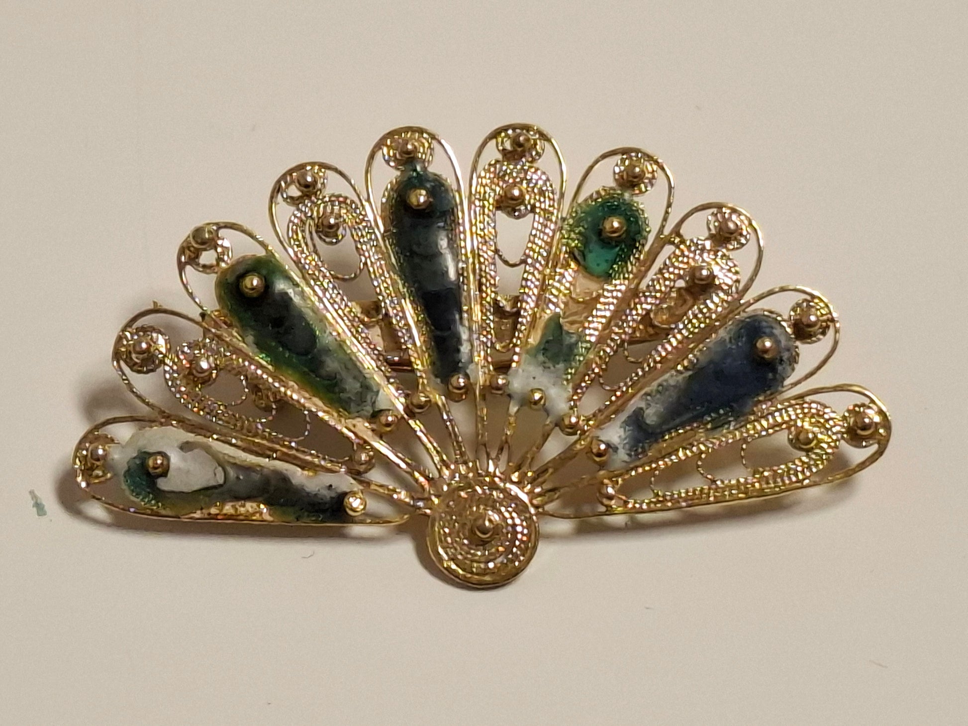 Vintage Gold Plated Email Filigraine Fan Brosche
